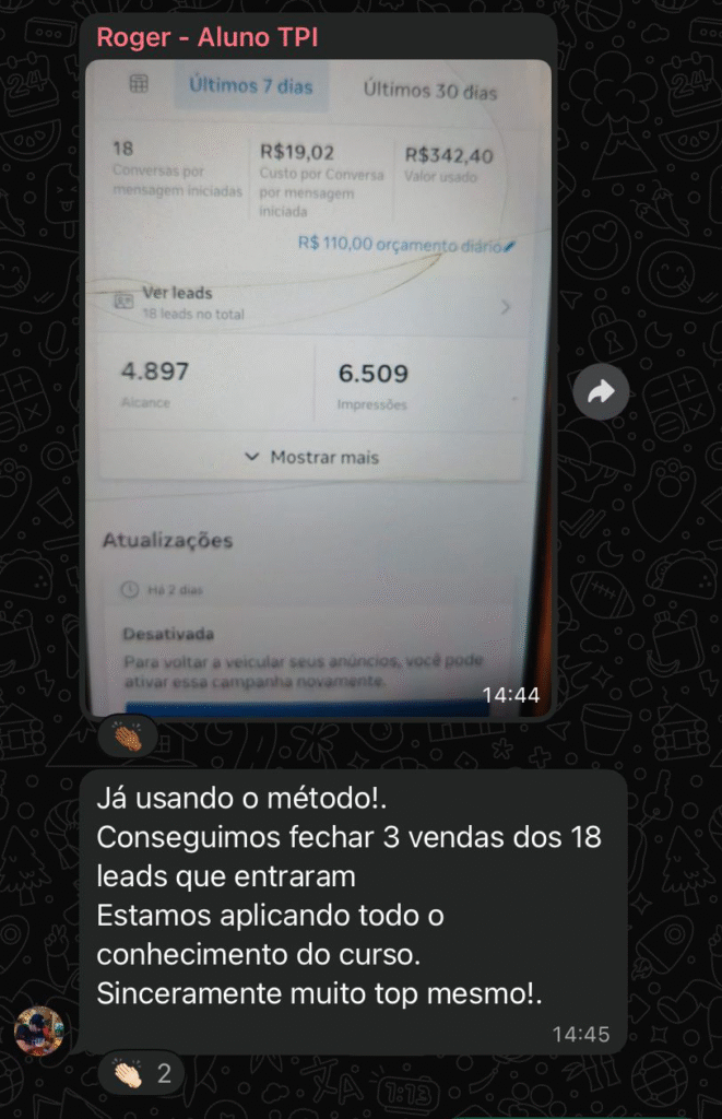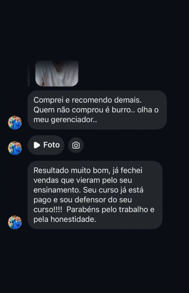 Foi aí que decidi fazer diferente. Aprendi a fazer tráfego por conta própria — e hoje é isso que gera a maior parte das minhas vendas.